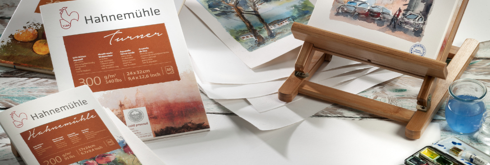 The watercolour paper made by Hahnemühle is a real vat paper, produced on a cylinder mould machine, which gives it the characteristic deckle edge. The use of various types of natural felt gives this paper a unique surface structure. Many artists are enchanted by our paper. The papers allow for optimum colour reproduction, have a resistant surface and withstand repeated erasures. These features make them suitable not only for watercolours, but also for other wet-painting techniques, such as gouache, tempera, opaque colours and lavis; as well as for drawing with charcoal, pencil and crayons.