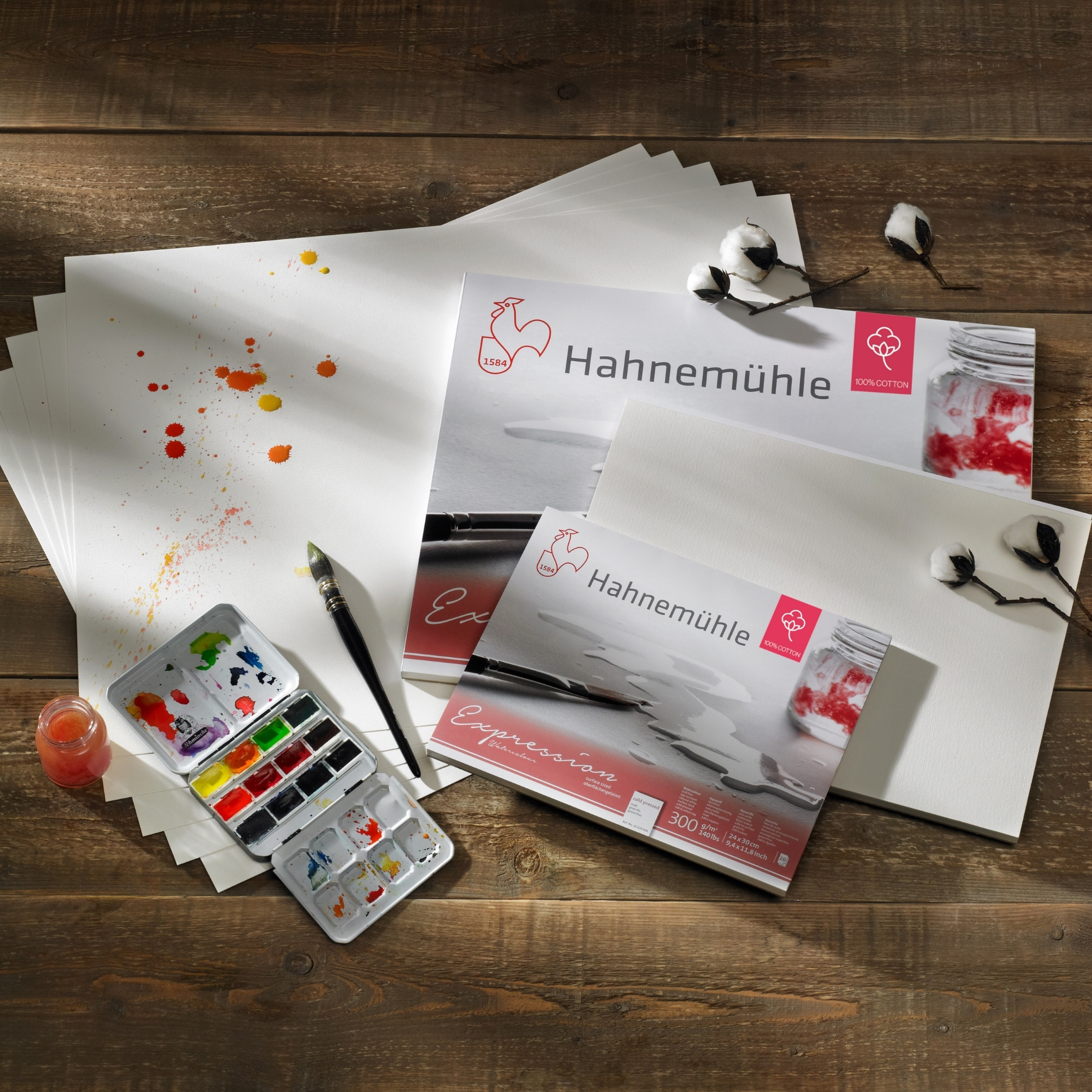 The Expression Watercolour is a natural white, 100% cotton 300 gsm paper for all wet painting techniques and etching, and features internal and surface sizing. Colours stand out excellently on the paper and impress with their natural brilliance, thus giving every subject its very own unique presence. Masking fluids or masking tape can be used and removed residue-free. While wet colours can be easily corrected or taken off. Expression Watercolour is acid and lignin free, light-resistant and features extreme longevity. The cold pressed surface is eraser-resistant due to the surface sizing.