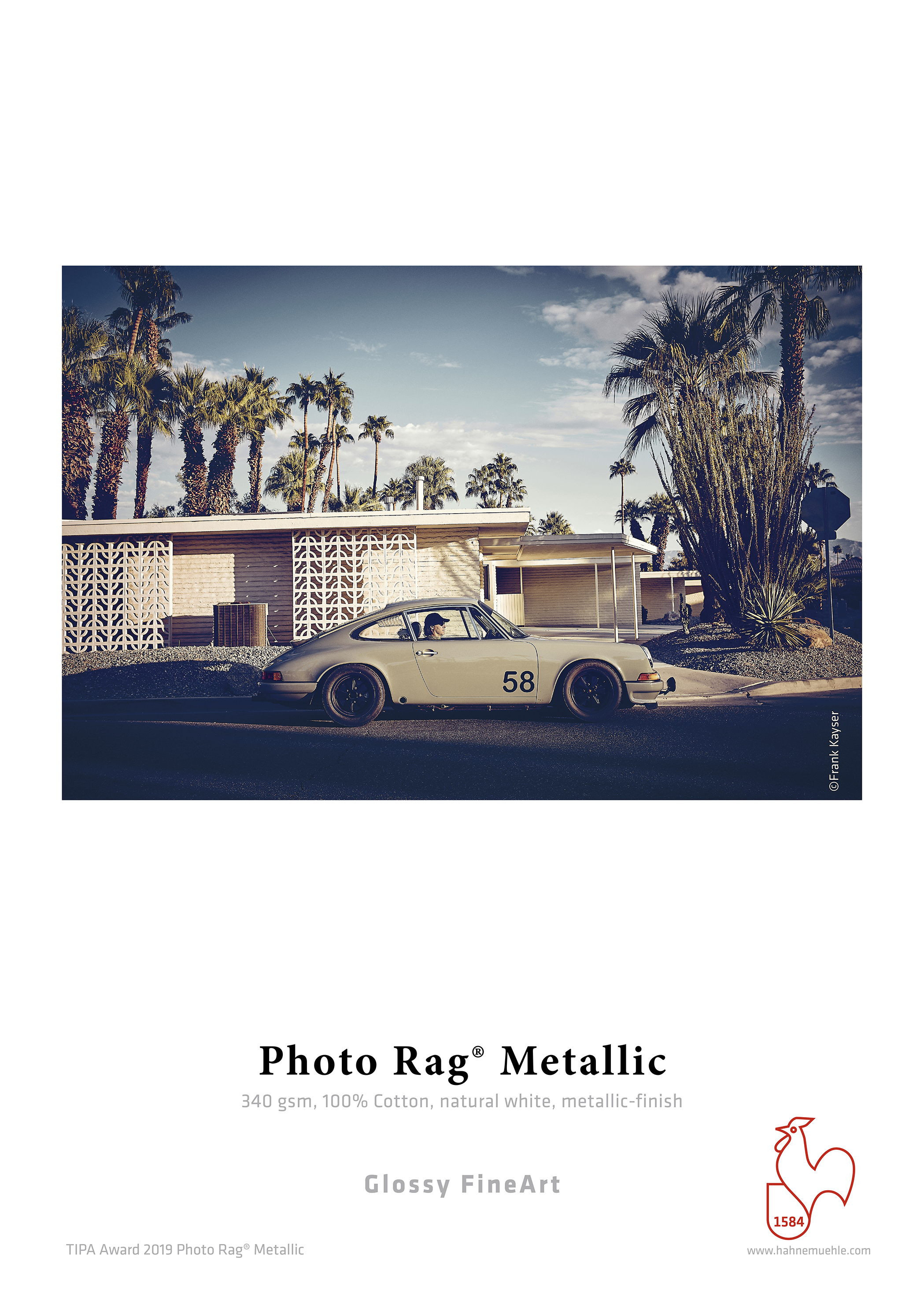 Hahnemühle Photo Rag Metallic is a silvery-shimmering FineArt inkjet paper with a specifically formulated inkjet coating for FineArt use. The natural white cotton paper contains no optical brighteners and has the characteristic Photo Rag surface structure and sumptuous feel. Photo Rag Metallic features a special silvery-shimmering surface finish. The high-gloss premium inkjet coating with a unique metallic effect guarantees impressive printing results with bold colours, deep blacks and the perfect reproduction of colour and detail. The sophisticated silver metallic effect underscores the image and makes motifs with metallic elements, reflections, ice and glass, architecture and landscape shots, as well as black and white photographs with high-contrast tones shine. Photo Rag Metallic is acid and lignin-free, and meets the most exacting requirements in terms of age resistance.